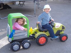 Außerdem sorgen das Trampolin, die Wippe, Rutsche, Schaukeln und Sandkasten, der hölzerne Spieltraktor, Basketballkorb und der große Kinderfuhrpark mit Kettcars, Roller, Dreirädern, Bobby-Cars, Kindertraktoren mit Anhänger, Stelzen, Federball und vieles mehr für ordentliche Abwechslung.